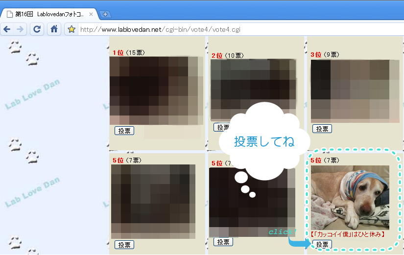 フォトコン 以前言っていたコンテストのことです!9月の写真コンテストに応募させて頂きました。サイトはLab Love Danさんです。「写真コンテスト」→会場は「こちら」の順にクリックで行けます。ルーク現在5位!投票期間は15日まで。さて、どうなるのでしょうか。どきどき。是非ルークに投票してください(笑)・・・ウソウソ。みんな可愛いのでお好きな写真に投票してみてくださいね♪