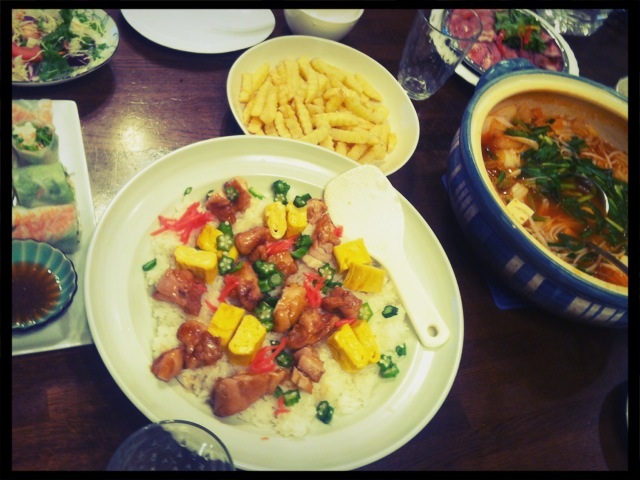 集合1 年末なので一家集合!ゴイクン、ローストビーフ、フライドポテト、とりたま寿司、キムチ鍋...etc.てな具合に、みんなの好みを反映したら多国籍dinnerになりました♪(^_^)食後はルーク兄が買って来てくれたデザート♪我が家はデザートも好みがバラバラなんだけど、それぞれにドンピシャなチョイスでした(^_-)