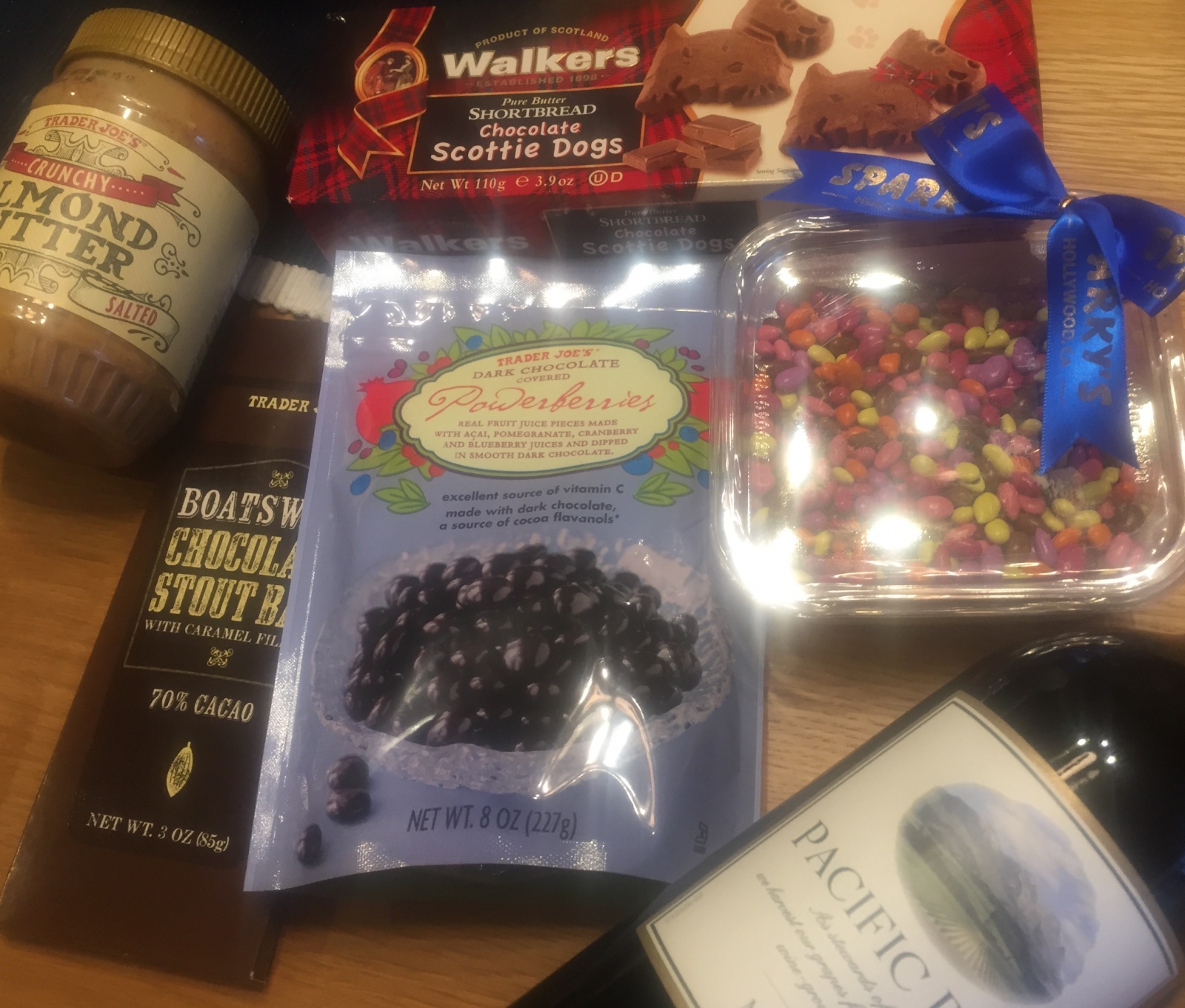 米国土産3 クッキーとチョコはルーク兄が買っておいてくれました♪^_^スパーキーズのリボンが乗っかってるのはチョコのついたサンフラワーシードです。左のこのアーモンドバターは甘くなく無限に食べられそう!笑ワインはまだ開けていません\(^o^)/